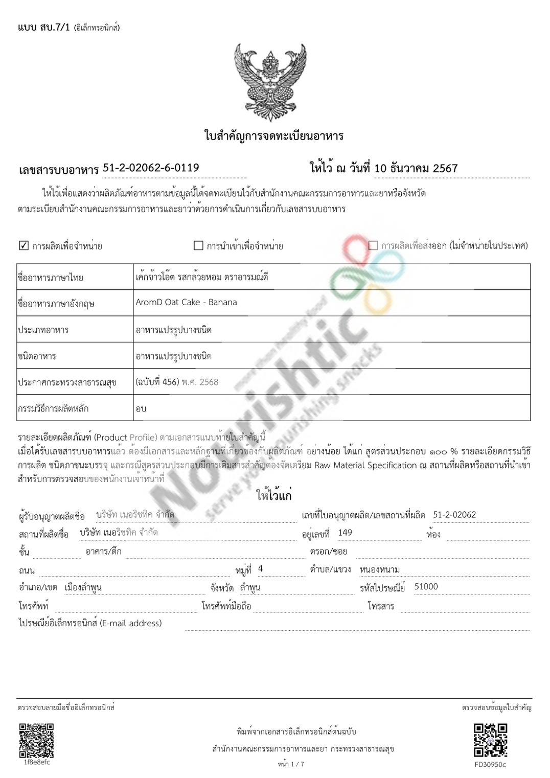 ได้รับอนุญาตผลิตอาหาร จากสำนักงานคณะกรรมการอาหารและยา กระทรวงสาธารณสุข