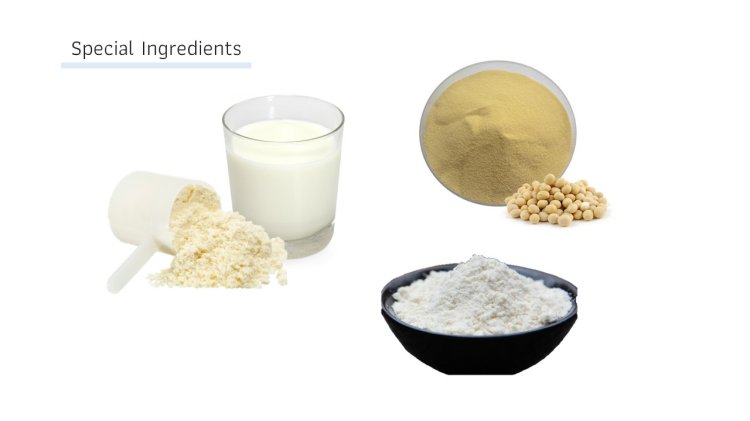 ส่วนผสมพิเศษ ช่วยเพิ่มความน่าสนใจและจุดขายของขนมสุขภาพ ทั้งยังช่วยเพิ่มคุณประโยชน์บางอย่างให้กับกลุ่มลูกค้าให้พอใจในขนมสุขภาพยิ่งขึ้นได้ ได้แก่ โปรตีนจากพืช เป็นที่สนใจและต้องการในกลุ่มคนที่รักสุขภาพผู้หญิงและรับประทานเจ แคลเซียมเป็นที่ต้องการในกลุ่มเด็กและผู้สูงอายุ